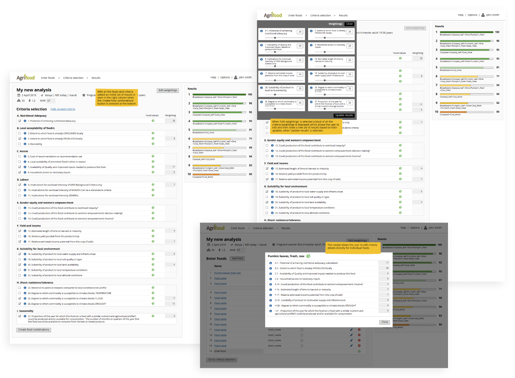 This was then followed by a set that covers the fine tuning of results. Agrifood incorporates a multi-criteria decision tool used to provide advanced weighting based a number of critical factors. Likelihood of water availability as an example, in a region typically affected by drought for prolonged periods.