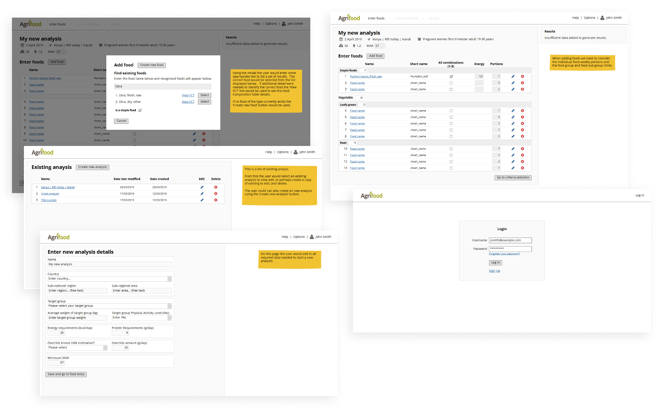 We initially conducted a workshop with Frances Knight and Prof Elaine Ferguson two key stakeholders from LSHTM. It was clear at this point that they had a clear requirement to take a very complicated calculation and translate this into an easy to user web based interface. We identified several key tasks. 1) Importing existing known food data. 2) Being able to edit this data as is required. 3) The initial setup of what became known as an analysis. Required detail specific to the analysis includes location, target group, e.g. under 16's, pregnant women, and energy requirements. 4) Adding foods based on known factors. 5) Identifying criteria, from 27 provided, specific to the analysis, e.g. Extent to which food is consumed locally, Estimated length of time to harvest maturity, suitability of product to local soil quality or type. 6) Applying weightings to the criteria, e.g. the food type must be particularly tolerant to flooding, as the analysis takes place during the monsoon season. 7) A detailed set of results, with the option to drill down into ver specific detail as required.