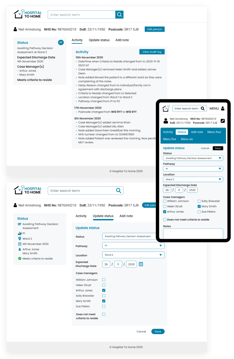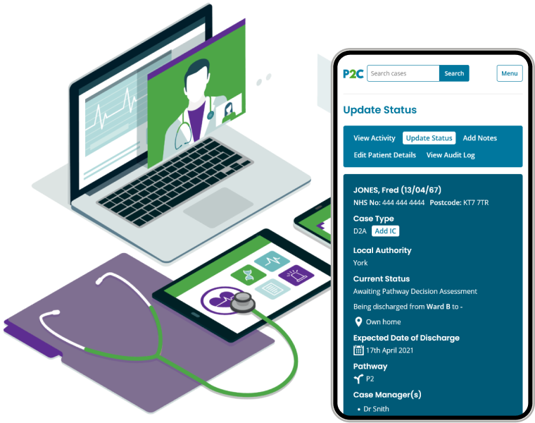 P2C offers case management, tracking and reporting features, allowing users from multiple organisations to create, update and monitor D2A cases across multiple pathways on an open, human driven platform. P2C supports the D2A process from the point at which a person is identified on the ward as requiring support on discharge, through to the point that the person receives an assessment on their longer term needs within a community setting.