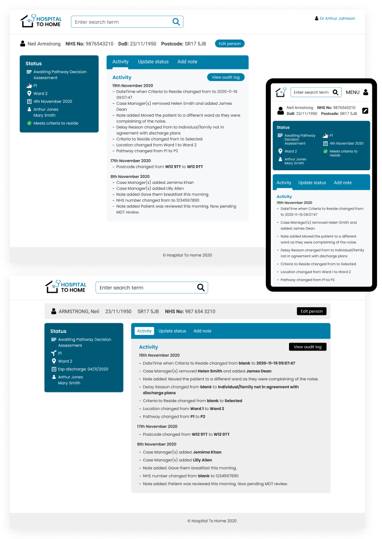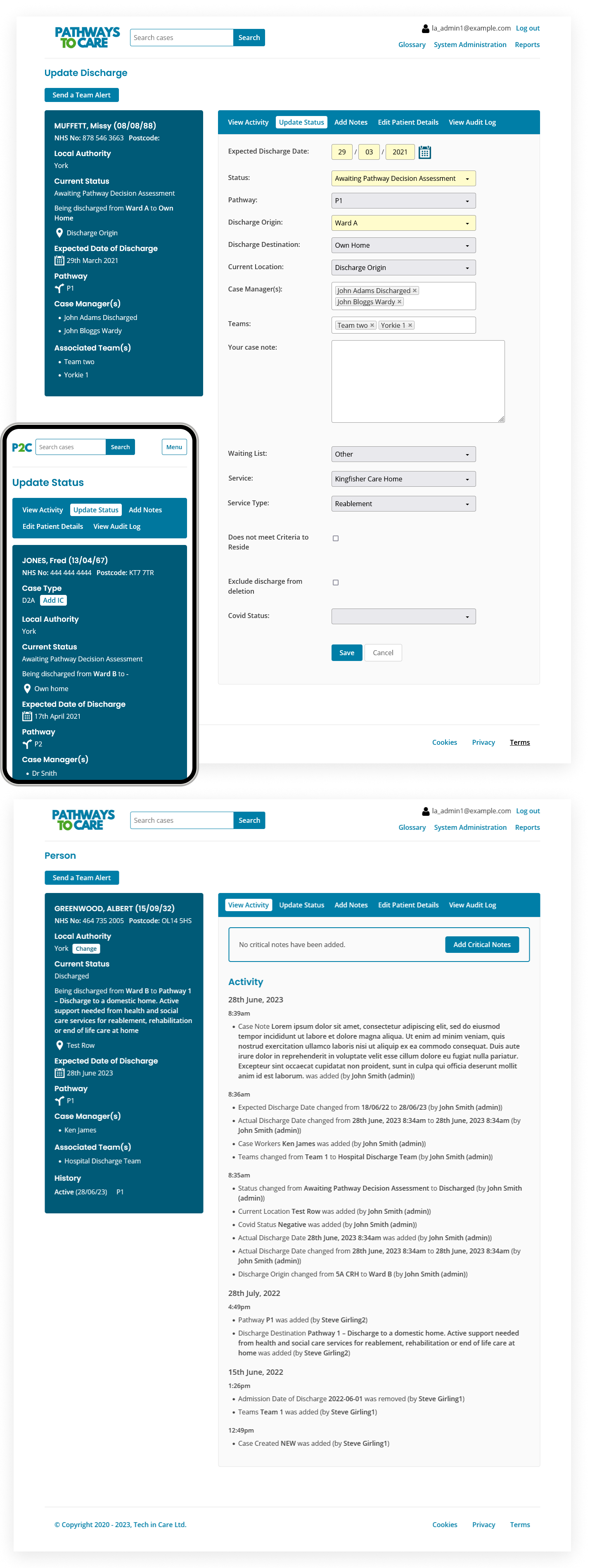 P2C offers case management, tracking and reporting features, allowing users from multiple organisations to create, update and monitor D2A cases across multiple pathways on an open, human driven platform. P2C supports the D2A process from the point at which a person is identified on the ward as requiring support on discharge, through to the point that the person receives an assessment on their longer term needs within a community setting.